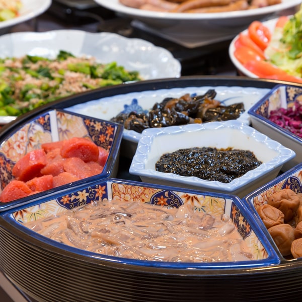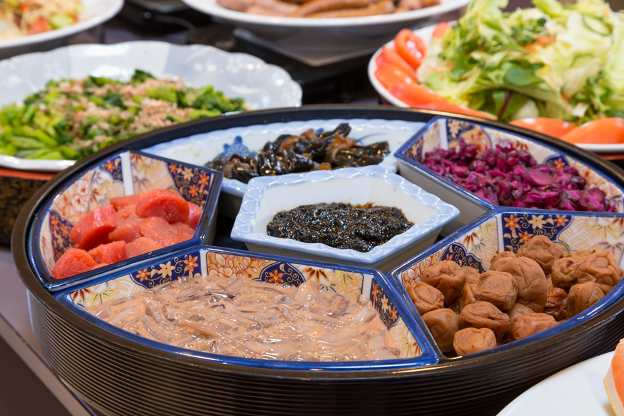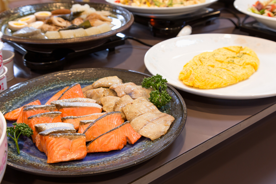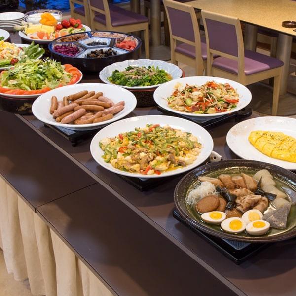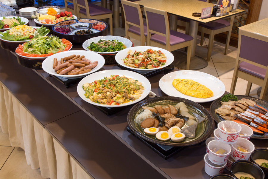 【朝食】税込 1,200円(営業時間7:00~9:30)和洋をバランスよくセレクトした20種類以上の朝食バイキング。旬の野菜や魚を食材に煮物や焼き物、和え物など数多く並びます。(写真はイメージです。クリックすると拡大表示します。)