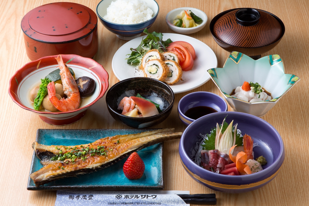 【夕食】税込 2,600円(営業時間18:00~20:30)お肉や焼き魚、お造り、小鉢や煮物など、連泊いただいても飽きない日高の味覚をご提供致します。夕食はご予約制です。宿泊者以外は2,800円(税込)となります。詳しくはホテル(0146-42-0425)まで。(写真はイメージです。クリックすると拡大表示します。)